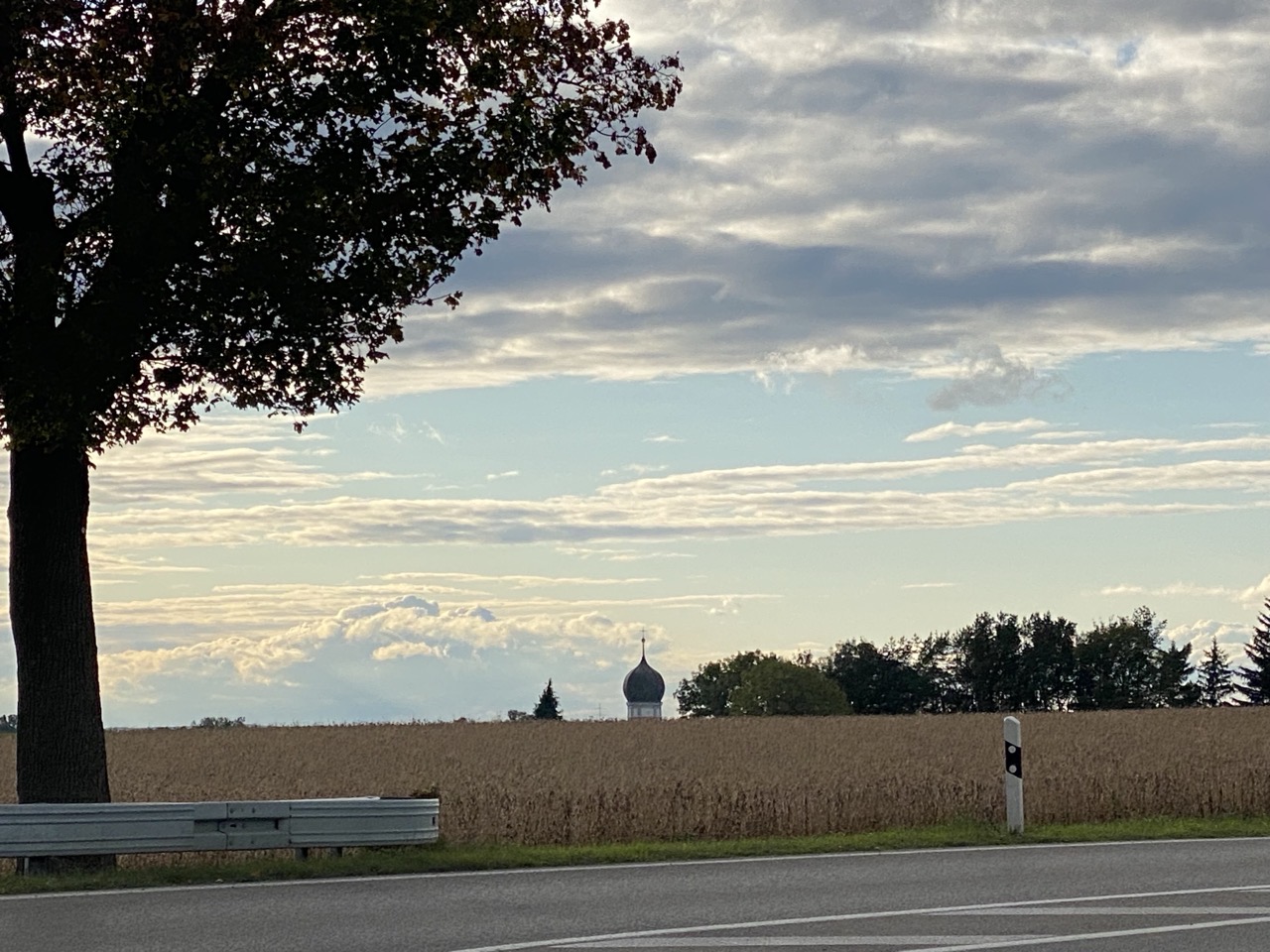 Im Ergebnis kann ich erst heute losfahren. Entspannter wird die Fahrt dadurch nicht, aber immerhin komme ich für meine Verhältnisse recht früh los. Einmal diagonal durch die Stadt und als gegen 11 Uhr ein Regenschauer durchzieht, dem ich es nicht gönnen will, gleich am ersten Tag die Regenklamotten einzuweichen, bin ich schon in Lochhausen und verkrümele mich in einem Café. Nach der Unterbrechung geht es über Fürstenfeldbruck und Mering weiter nach Augsburg, wo ich unmittelbar nach Einbruch der Dämmerung eintreffe. Das wird mir auf dieser Tour wahrscheinlich regelmäßig passieren, weil die Tage schon nicht mehr richtig lang sind.