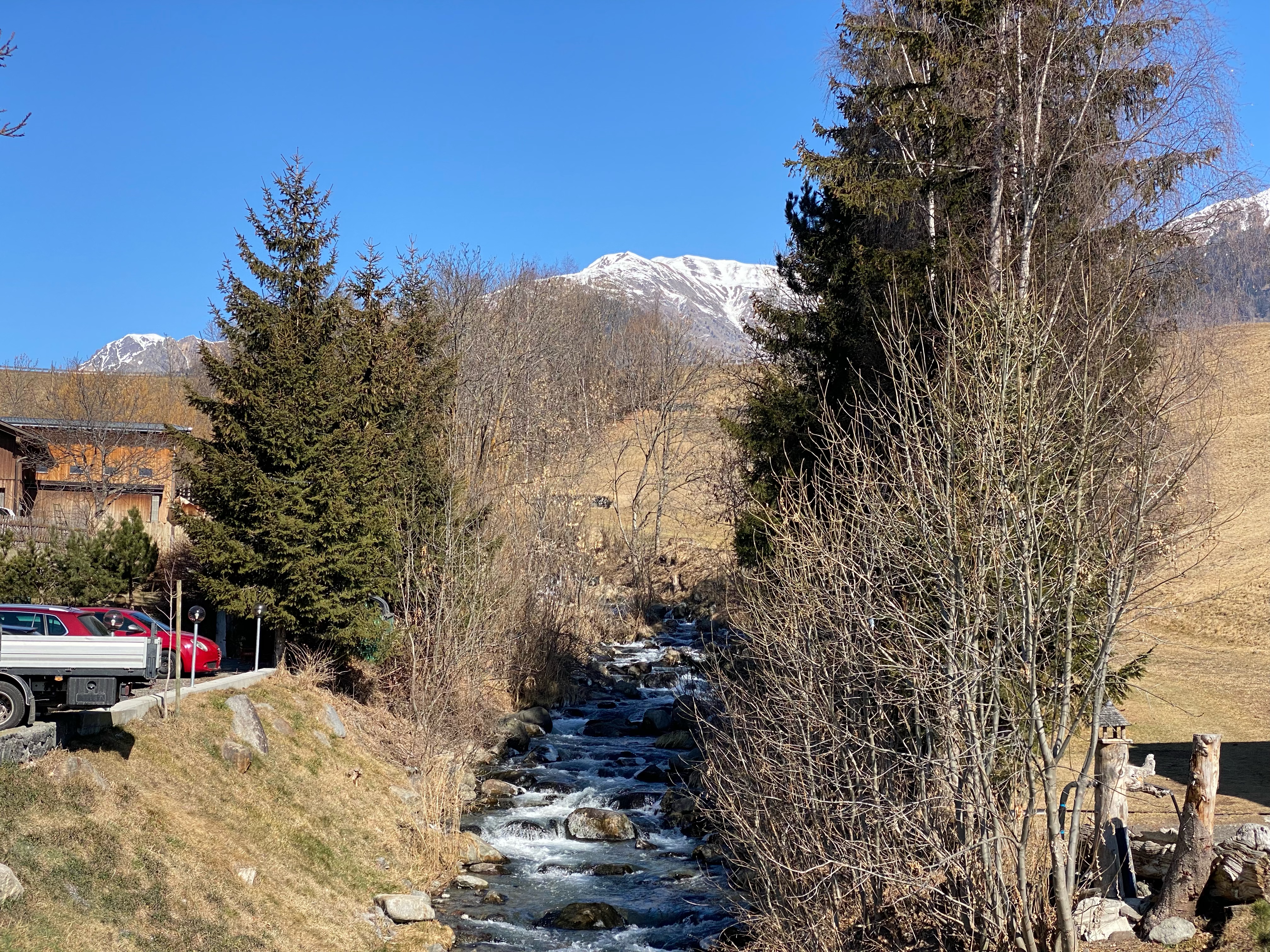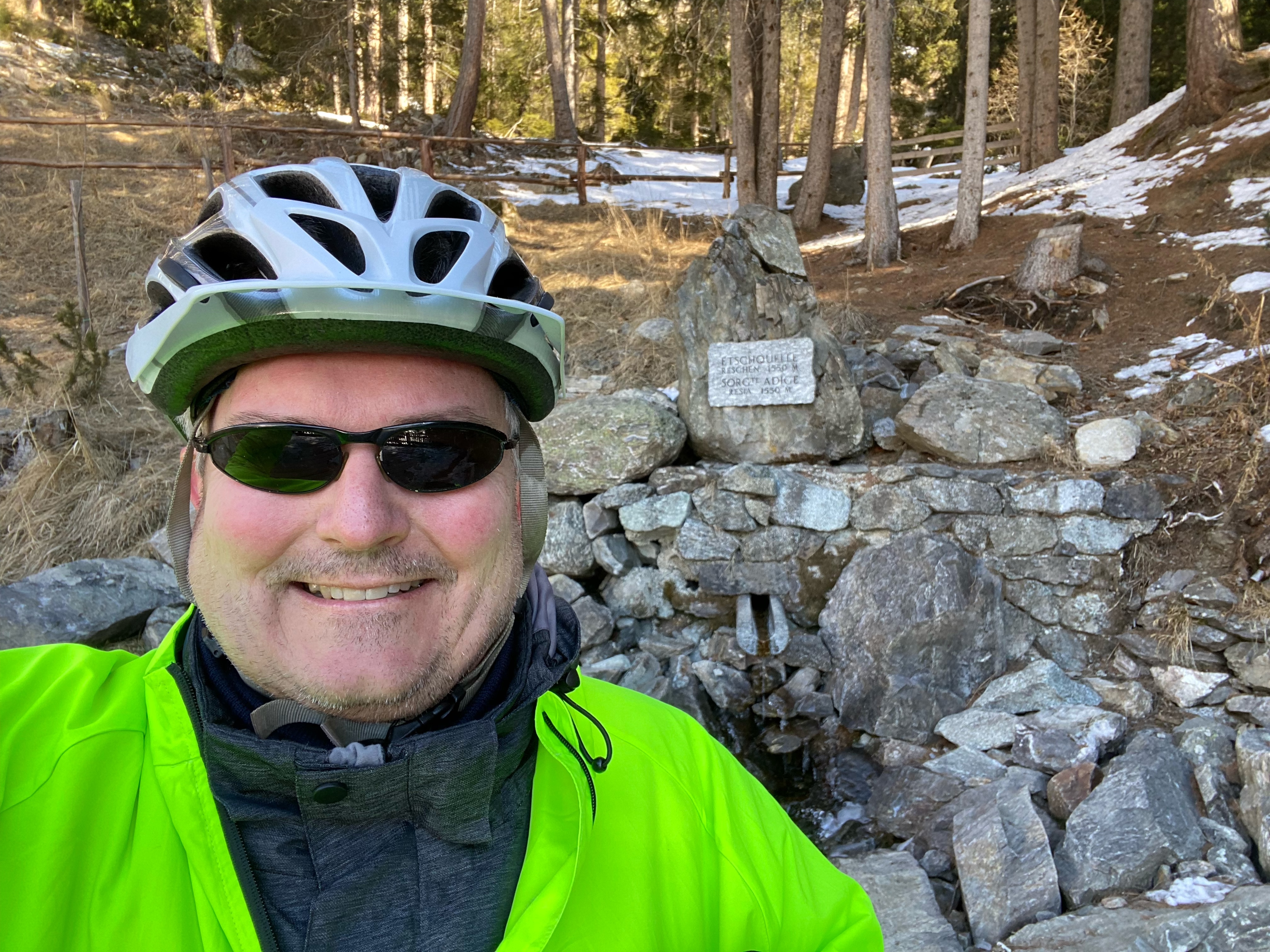 Nach einem guten Frühstück will ich als Erstes natürlich zur Etschquelle, die eigentlich nur gut 50m oberhalb der Häuser von Reschen liegt. Aber es liegt noch viel Schnee und auf den Wegen einiges an Eis.