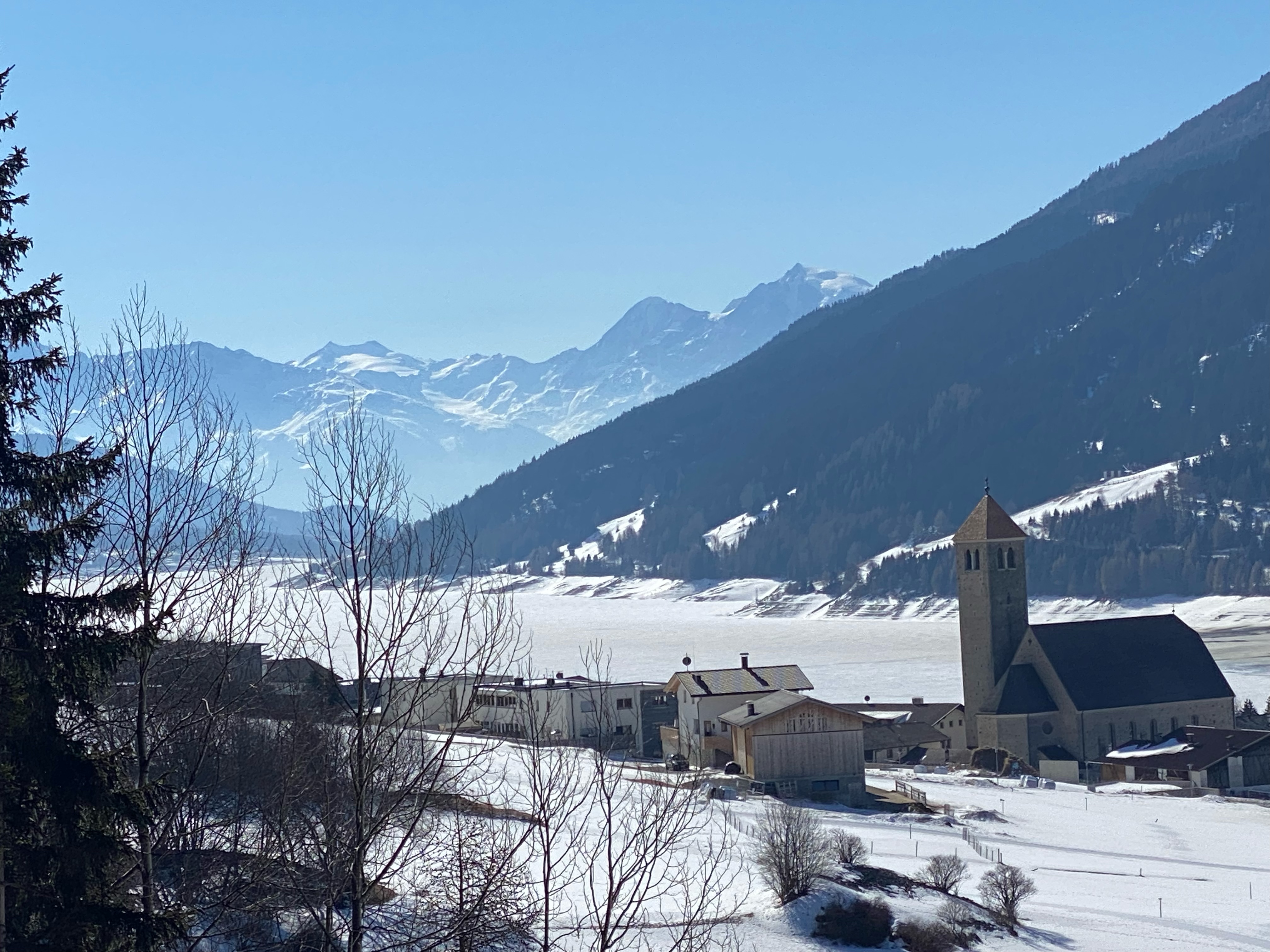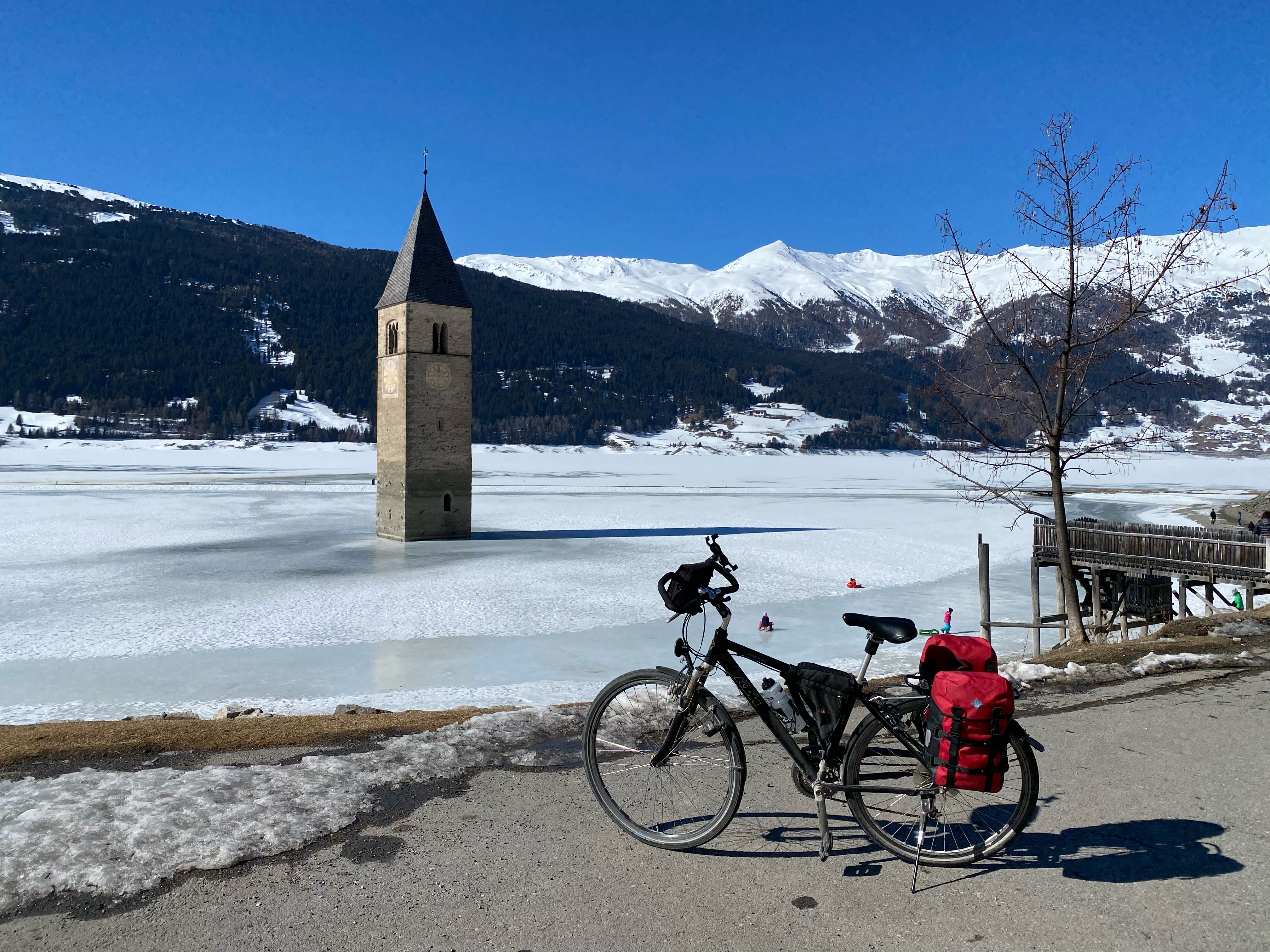 Nachdem ich mein Fahrrad, das ich an einem Baum neben der Langlaufloipe angeschlossen hatte, wieder erreicht habe, geht die eigentliche Radtour los. Entgegen der überraschenden Vermutung der Wirtin ist der Radweg am Reschensee nur teilweise schnee- und eisfrei. Daher muss die Staatsstraße herhalten, die zum Glück noch schwach befahren ist.