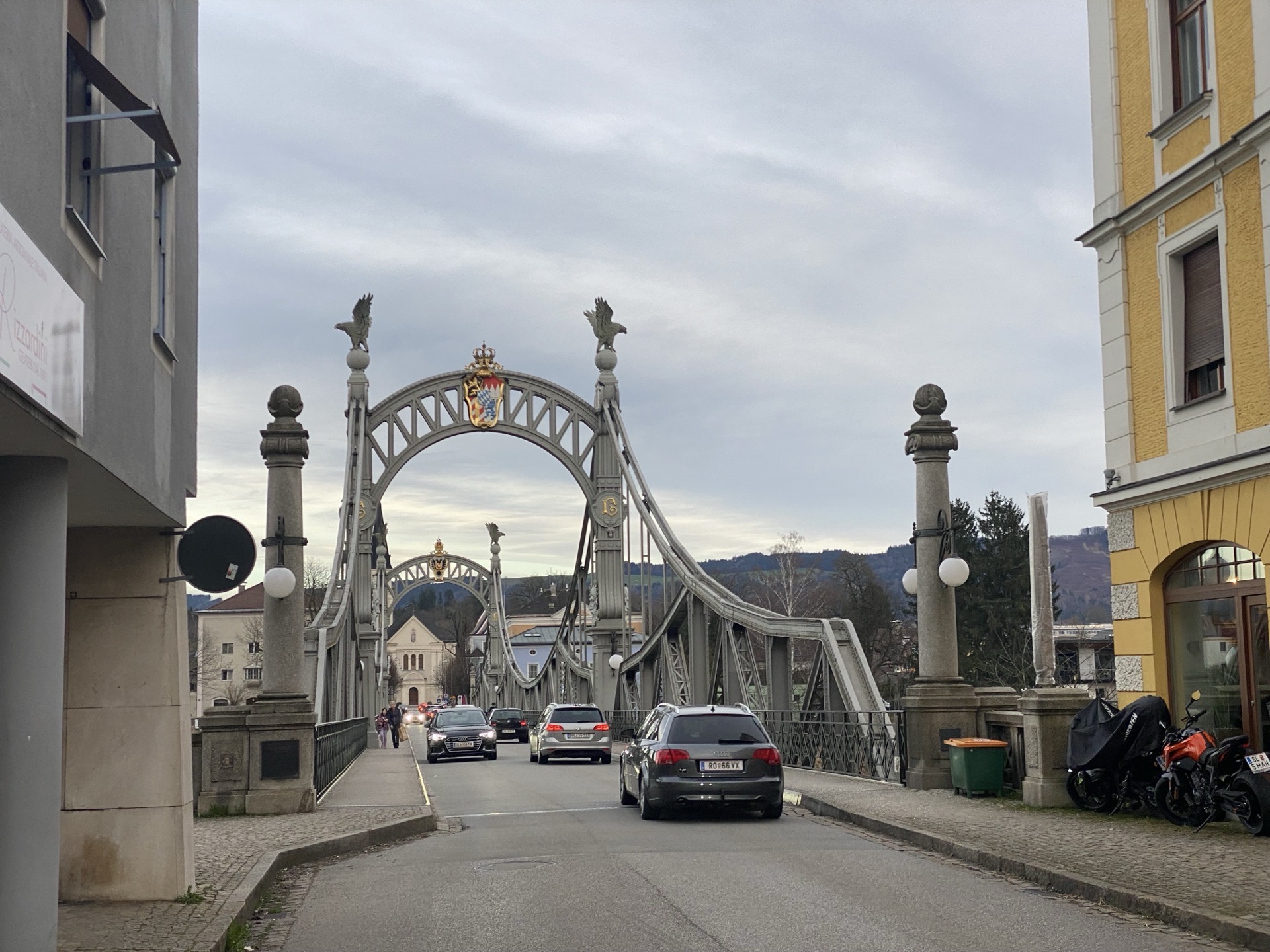 Ich beschließe, bis Laufen zu fahren und es da für heute gut sein zu lassen. Die Salzachschleife um die Laufener Altstadt ist länger gestreckt und nicht ganz so kurz vor dem Durchbruch wie die des Inn um Wasserburg, aber das Gesamtgebilde ist trotzdem sehenswert - auch die Salzachbrücke im Eisenfachwerkstil des Eiffelturms wenngleich natürlich mit den obligatorischen Wappen etc.