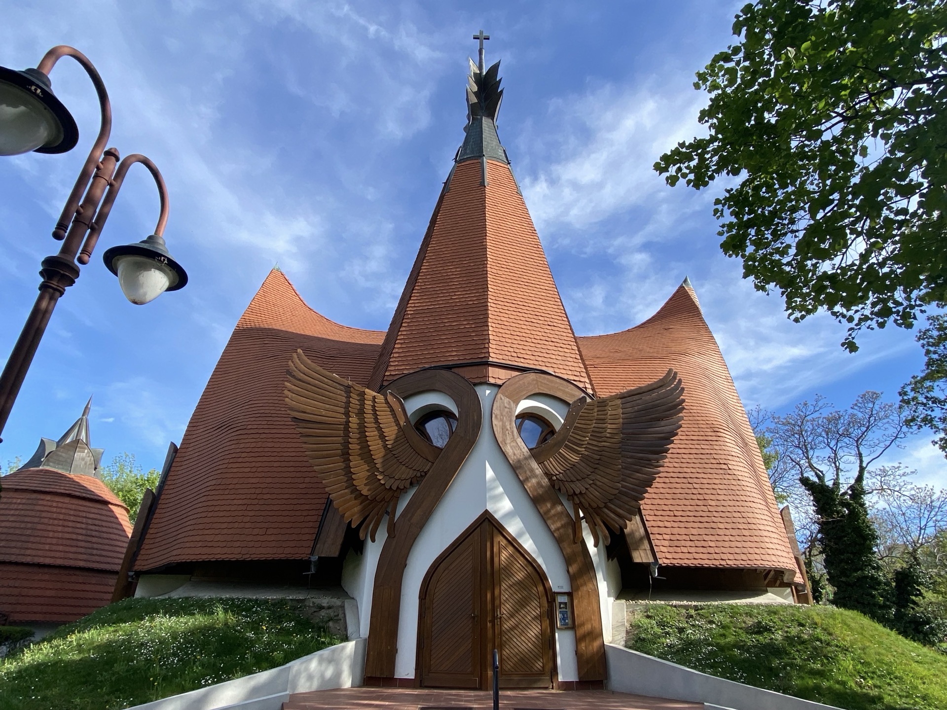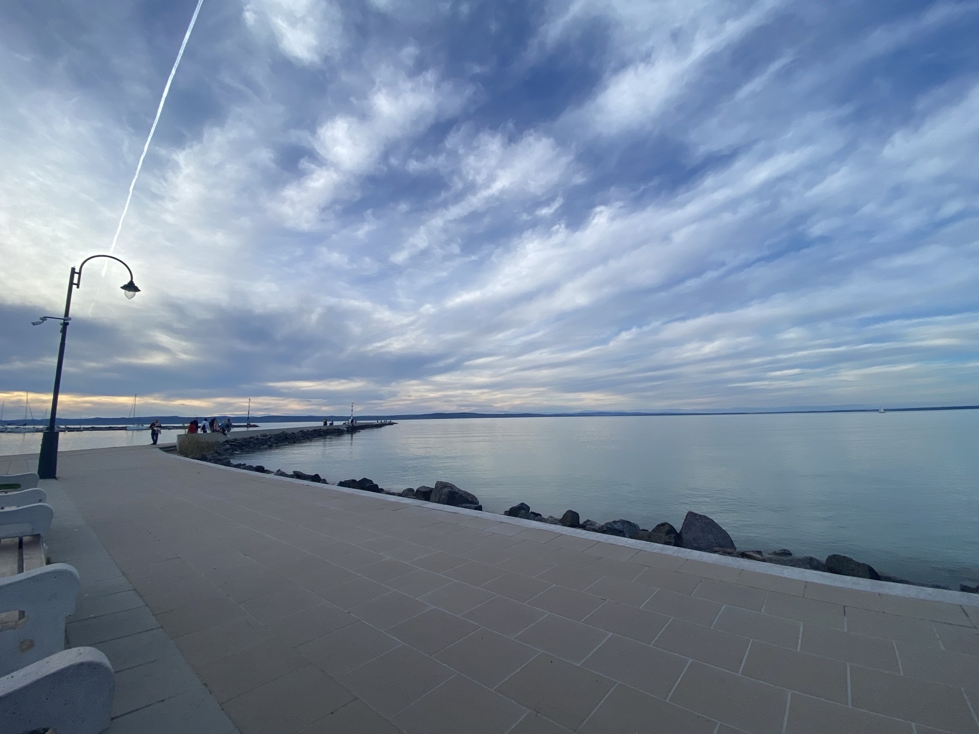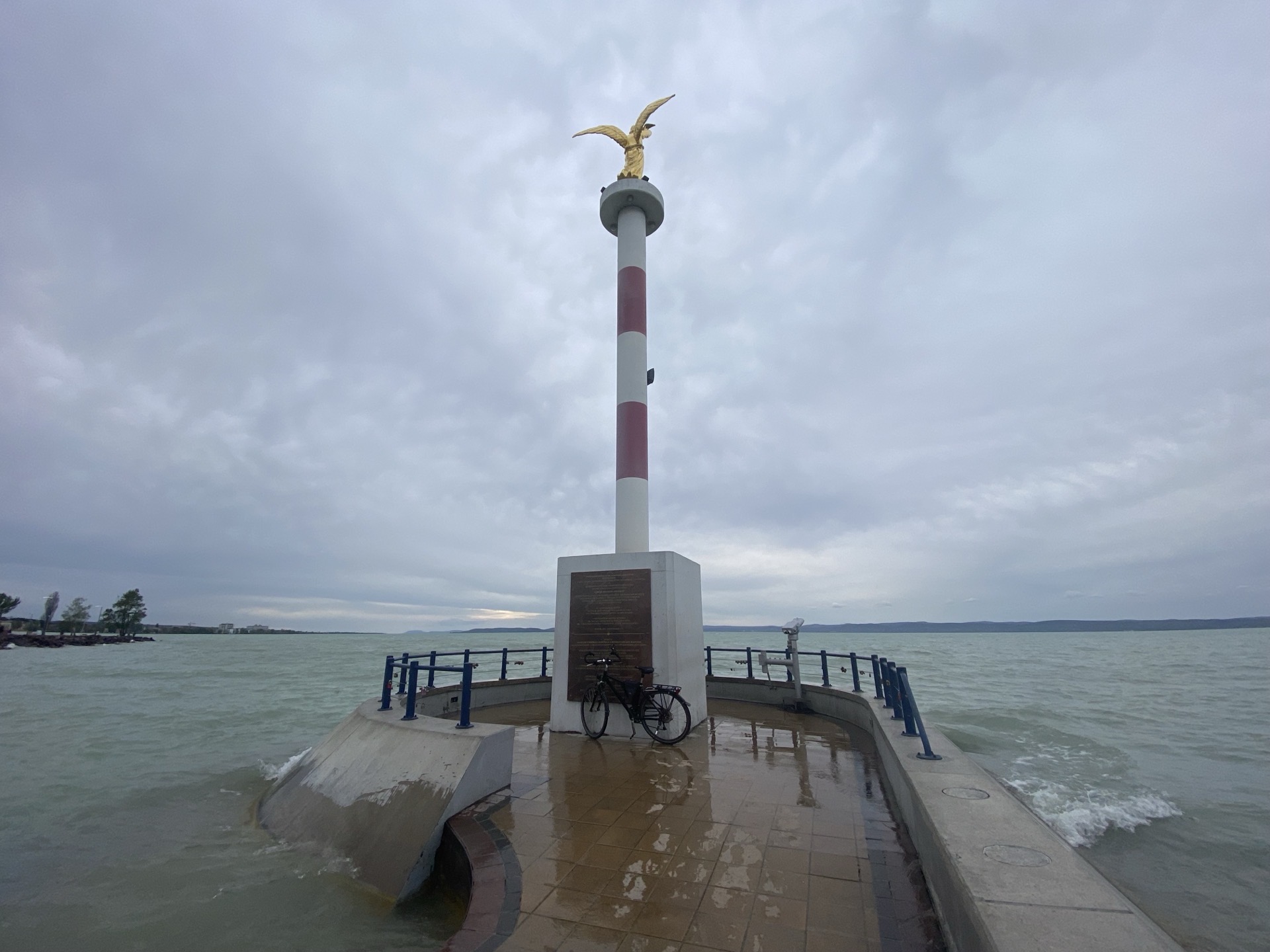 Der See ist von hier aus ganz gut zu überblicken, häufig allerdings hat er beim immer noch vorherrschenden, wenngleich etwas reduzierten Wind deutlichen Wellengang. Dass der kleine Friedensleuchtturm am Ende der einen Hafenmole davon allerdings ständig überschwappt wird, ist entweder verblüffend oder eine clevere, kostengünstig realisierte Komponente des Vergnügungsangebots. Am anderen Ende des Hafens fließt das Flüsschen Sió über zwei Schleusentore ab, die den Wasserspiegel des Sees weitgehend stabil halten und die diversen hübschen Uferpromenaden etc. am See vor Hochwasser schützen.