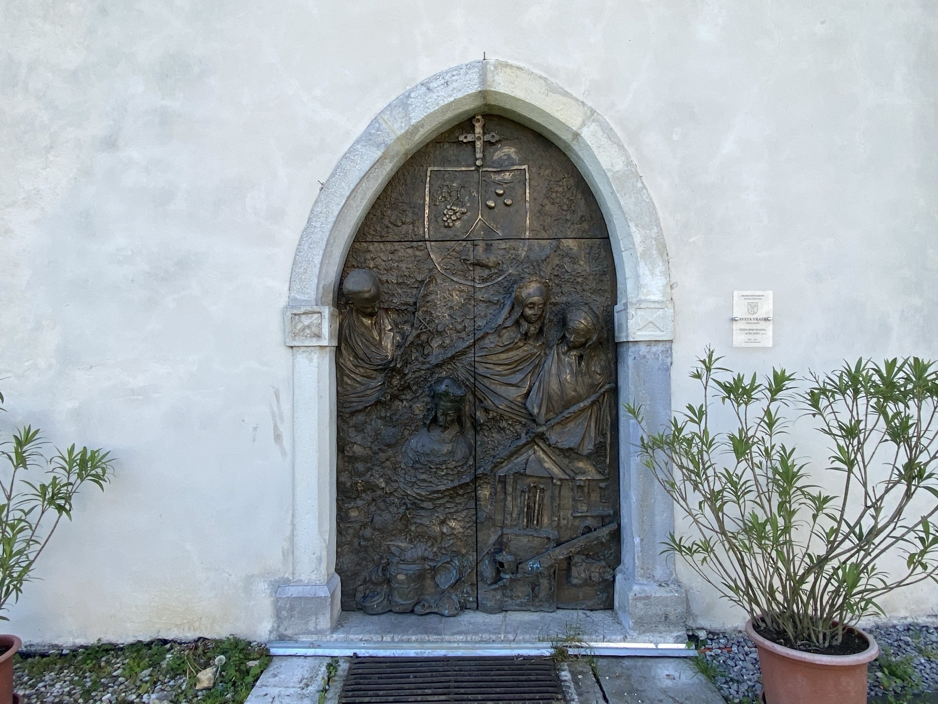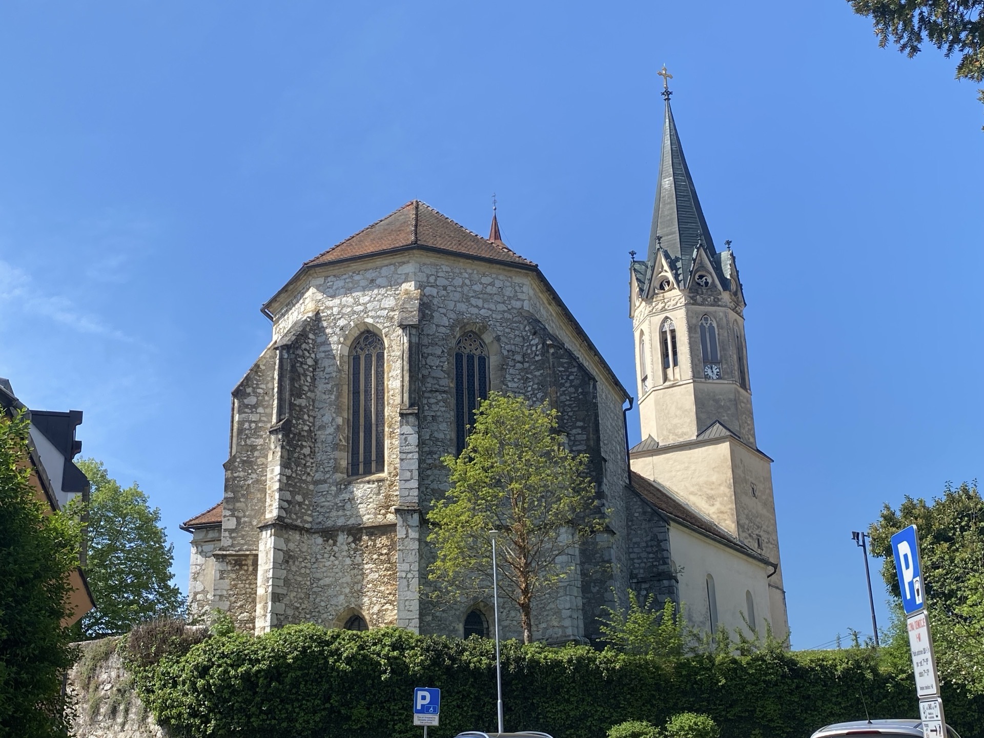 2006 wurde Novo Mesto dann selbst zum Bistum. Die dadurch zur Kathedrale beförderte Kirche besitzt schon lange ein Altarbild von Tintoretto und fällt mit einer geknickten Längsachse auf, was sich anlässlich einer Verlängerung des Kirchenschiffs aufgrund der Form des Kirchbergs seinerzeit nicht anders machen ließ. Der Kirchberg ist der höchste Punkt der Altstadt, die auf dem Hügel in besagter Gurk-Schleife liegt.