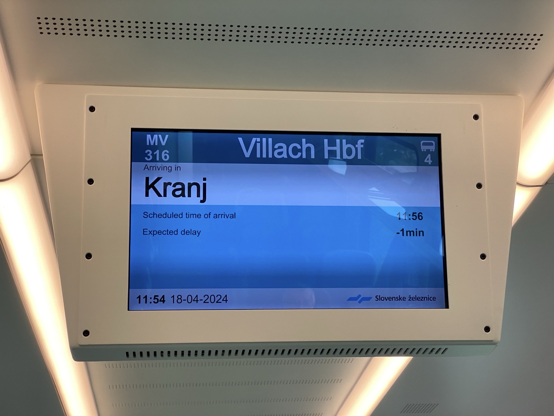 Und nach einer weiteren Nacht fahre ich mit dem Zug durch zum Teil noch leicht verschneite Täler zurück nach München. Dabei lerne ich einen Zustand kennen, den es in Zügen der Deutschen Bahn nicht geben kann, weil kein Programmierer auf die Idee kommen würde, dass so ein Fall mal eintreten könnte: das Display informiert darüber, dass der Zug eine Minute zu früh dran ist - eine negative Verspätung! Aber keine Hektik, liebe DB, es war nur auf dem Weg nach Villach, weit weg vom eigenen Zuständigkeitsgebiet…