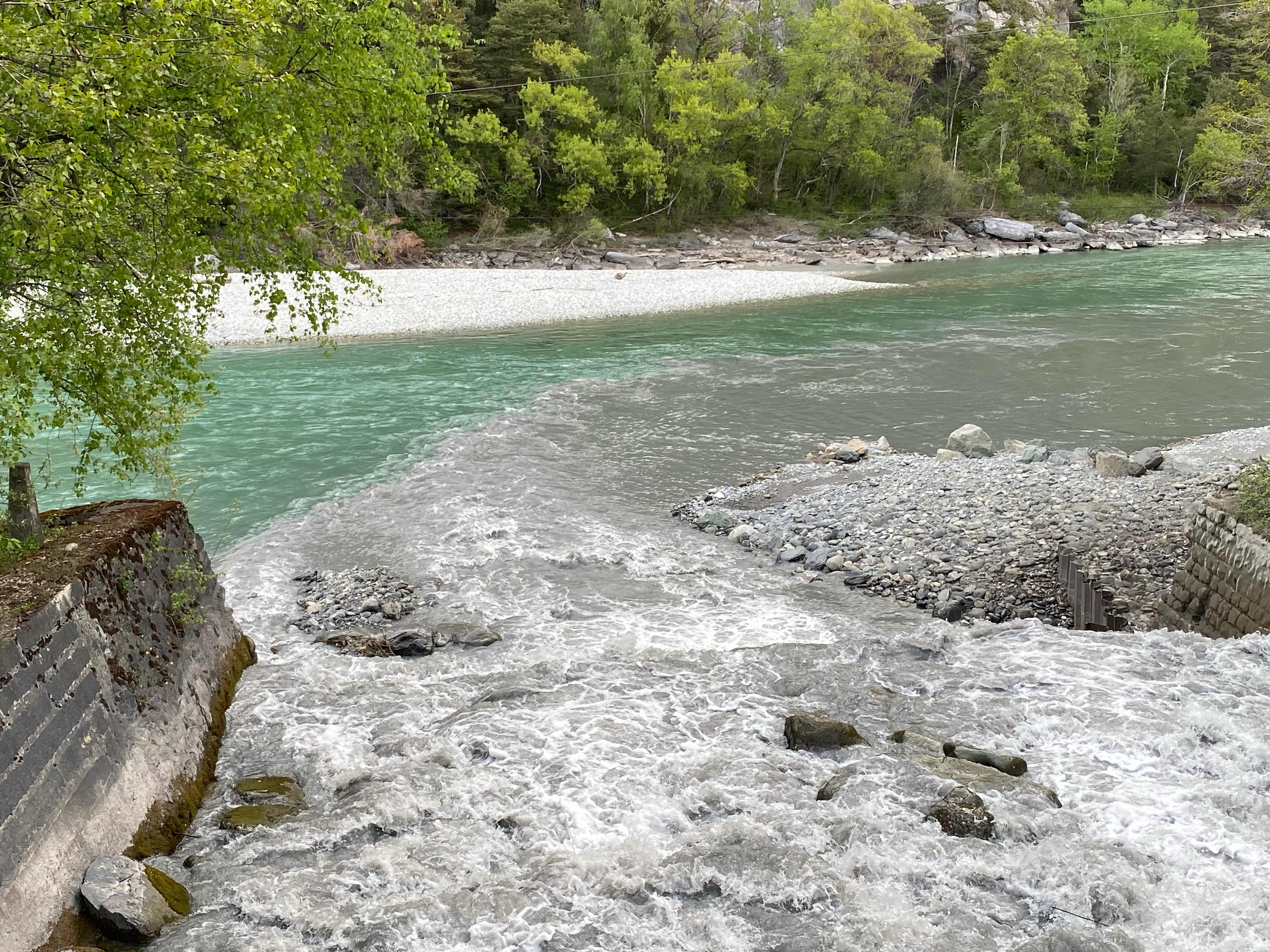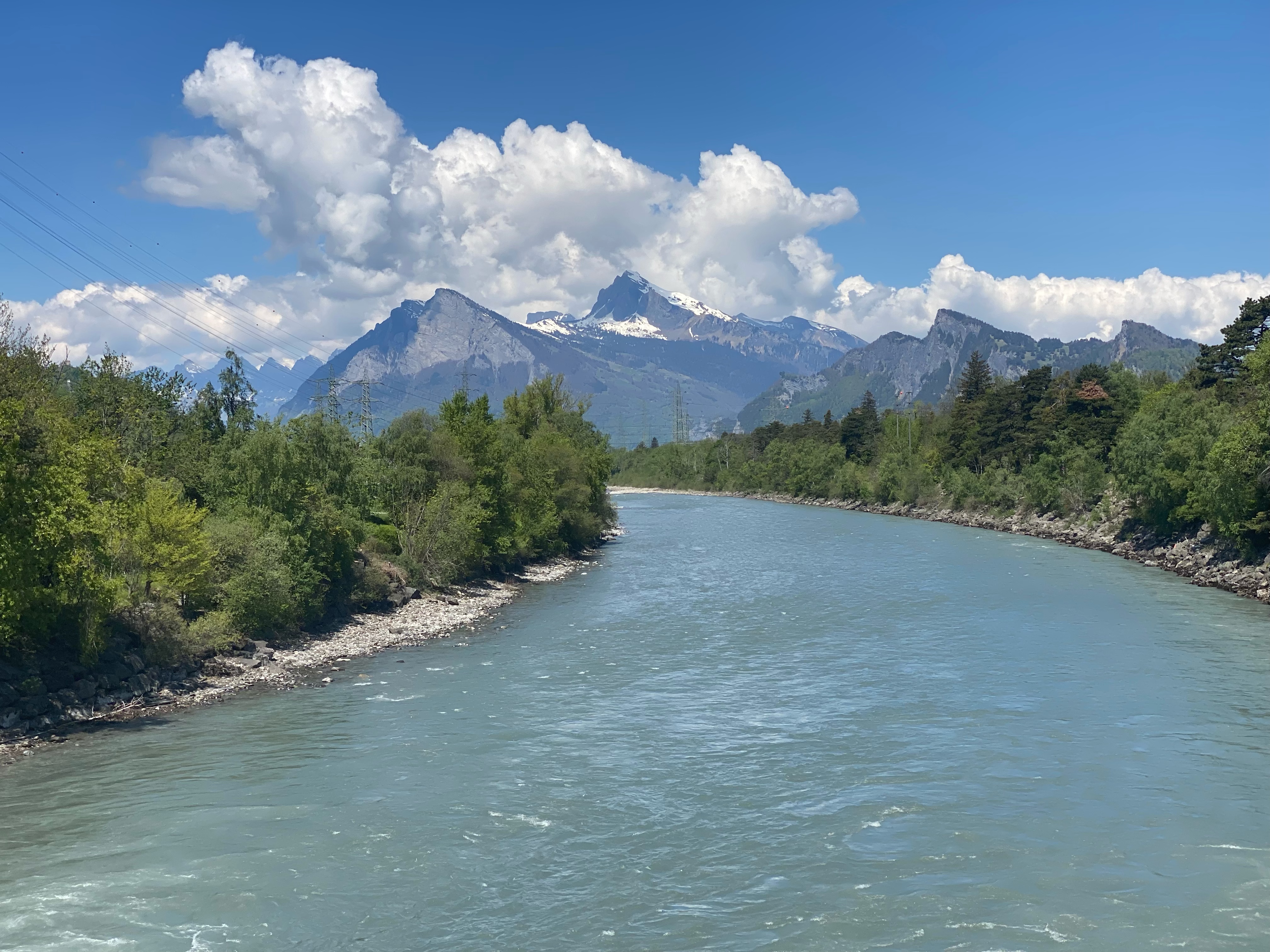 Der Rhein, von Reichenau bis zum Bodensee Alpenrhein genannt, ist inzwischen zum richtigen Fluss herangewachsen, allerdings ist er seit Chur und dem dortigen Zufluss der sehr sedimentreichen Plessur nicht mehr klar, sondern recht milchig geworden.