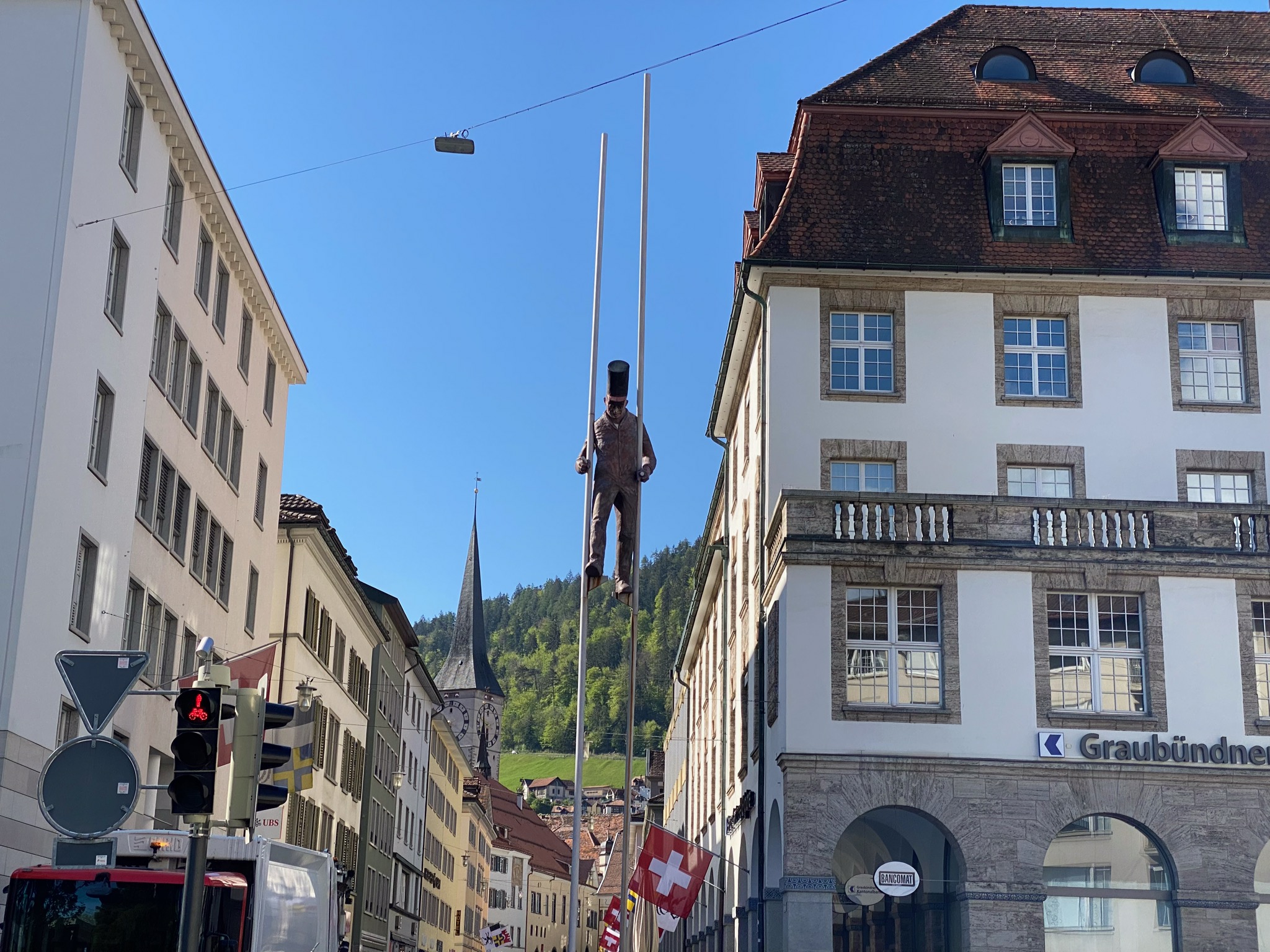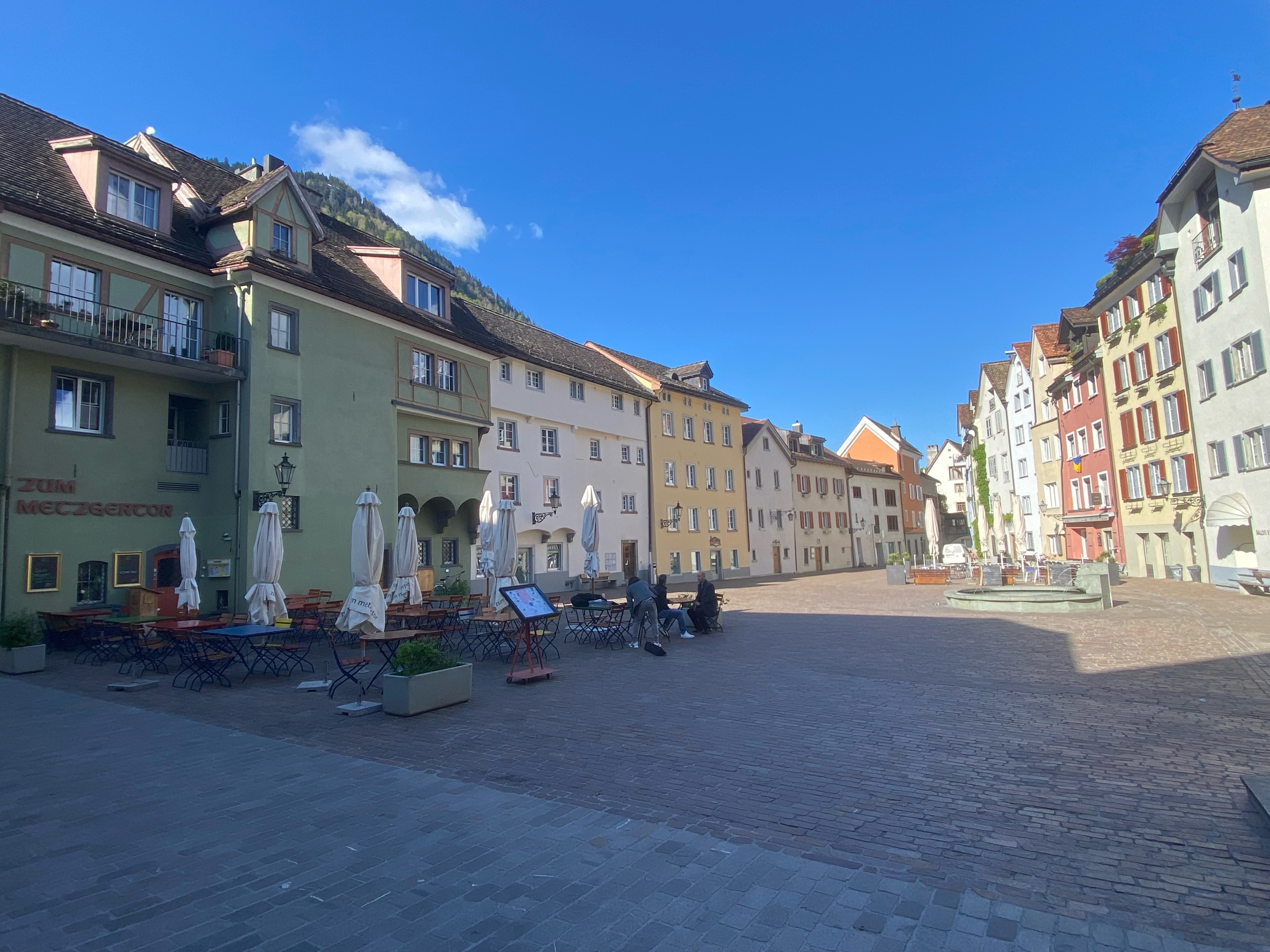 So macht ein Radtourentag Spaß! Das Wetter ist deutlich besser als vorhergesagt, genaugenommen sogar perfekt: schön und trocken, aber nicht zu warm. Schnell baue ich das Zelt ab und packe alles zusammen und auf geht‘s in die älteste Stadt der Schweiz zum Speed-Sightseeing. Es gibt verblüffend viele kleine Plätze, die die Stadt aufweist. Die Kathedrale ist eher übersichtlich, das bischöfliche Schloss dagegen um so raumgreifender insbesondere - bei allem Respekt - in Relation zur Größe der Stadt. Das wird aber vom Prachtbau der Direktion der Rhätischen Bahn noch locker getoppt. Der ansonsten sehr angemessene Graubündner Regierungssitz dagegen fällt eigentlich nur mit seiner Riesen-Blutbuche auf.